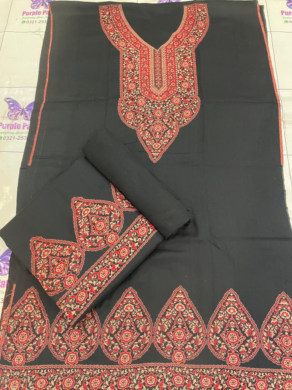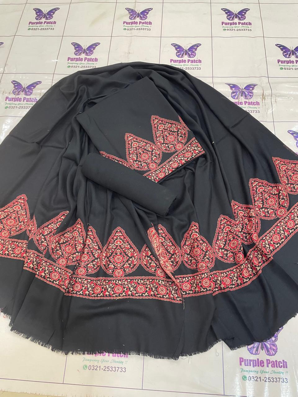 Work details: Kani ( Hand woven ) Shirt Daman UpTo 26 inches Shirt Length 43 inches Shawl 2.5 yards Trouser 2.5 yard Cleaning: Dry clean is always recommended and a safe solution if you are not confident in hand wash. Or, wash it in cold water using woolite. Detergent must be dissolved completely before putting pashmina in water. Do not twist during washing. Do not wring dry. Do not dry the Pashmina in direct sunlight after washing. In addition, spread it on a towel and put it in the air to let it dry naturally. Use very low temperature, iron with a cover sheet. To maintain its newness. Never hang a Pashmina in the closet as it can cause the fabric to stretch and lose its shape. Store your Pashmina in a muslin cloth to avoid the development of lint or short fibers that separate the surface of cloth or yarn. Fold it neatly inside out in moth-proof stuff. Keep your Pashmina at a cool, dry place. Stitching: We recommend Using a thin seam reinforcement: Pashmina is very loosely woven and can split apart, so you can use a thin seam reinforcement to reinforce the fabric where you’re stitching. Stitch pashmina suits an inch loose from your regular size. Make shalwar instead of pants. Stitching pashmina suits with under linings may reduce the chances of getting torn.