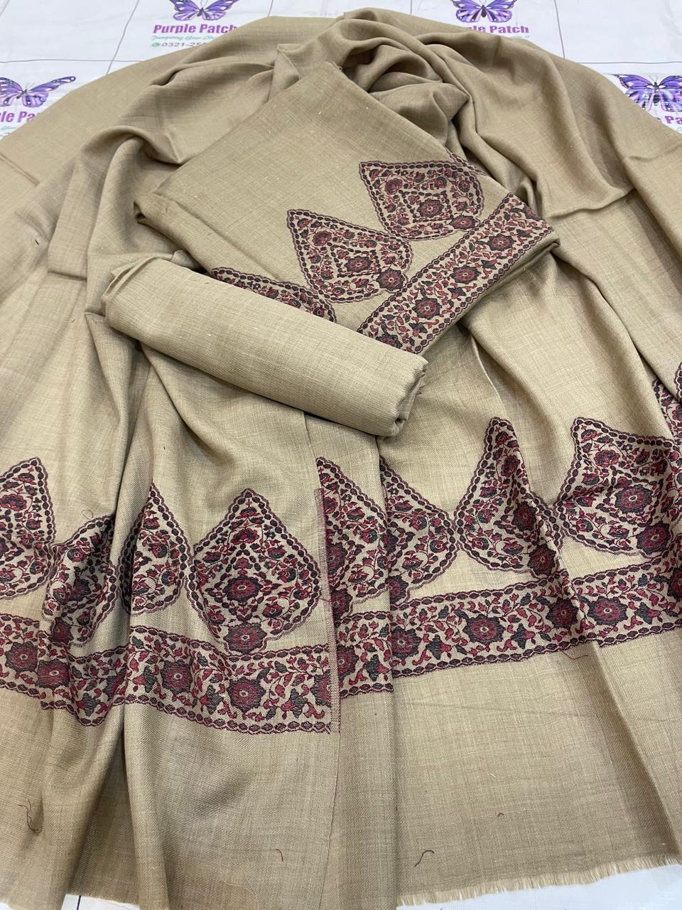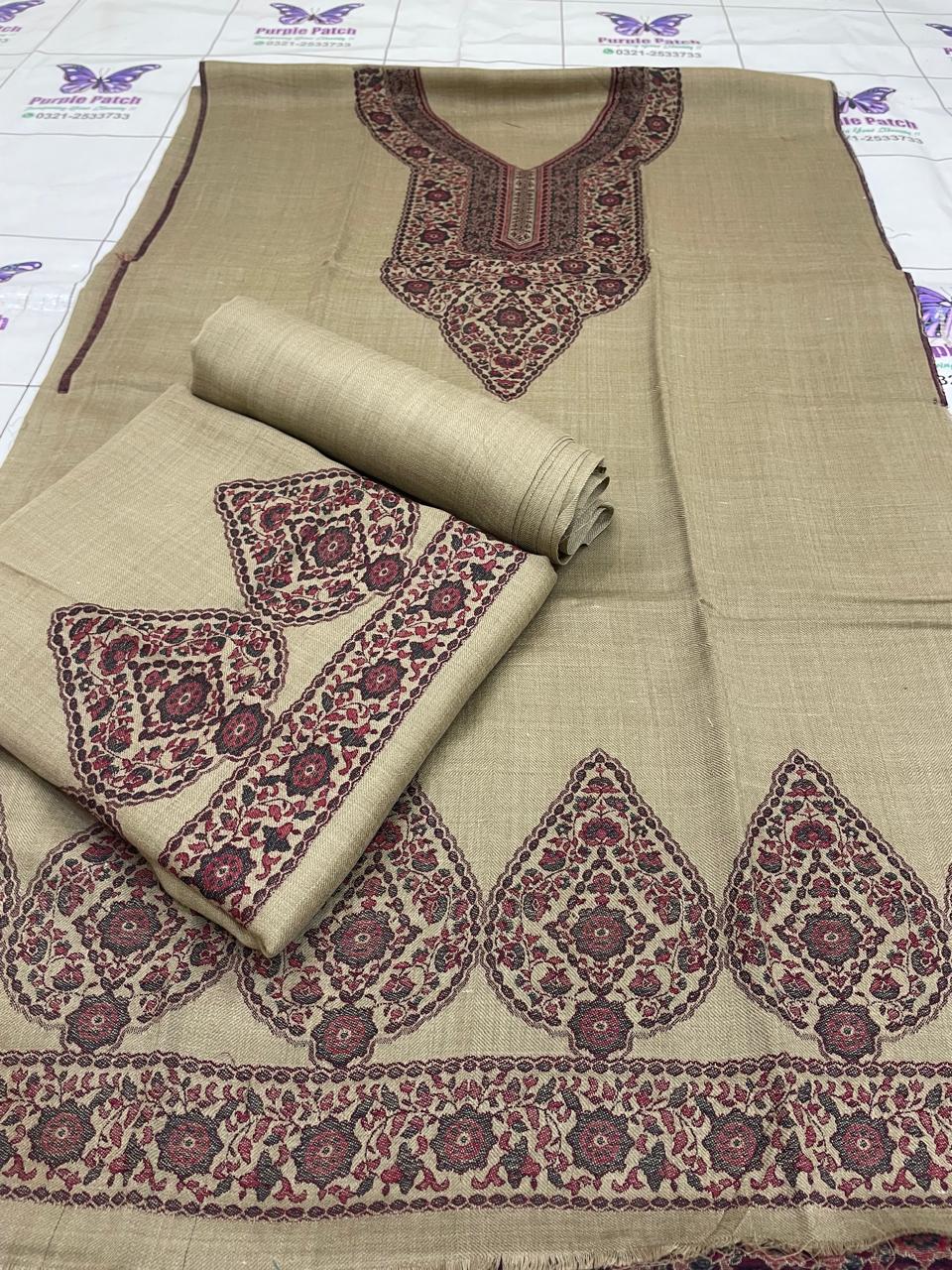 Work details: Kani ( Hand woven ) Shirt Daman UpTo 26 inches Shirt Length 40 inches Shawl 2.5 yards Trouser 2.5 yard Cleaning: Dry clean is always recommended and a safe solution if you are not confident in hand wash. Or, wash it in cold water using woolite. Detergent must be dissolved completely before putting pashmina in water. Do not twist during washing. Do not wring dry. Do not dry the Pashmina in direct sunlight after washing. In addition, spread it on a towel and put it in the air to let it dry naturally. Use very low temperature, iron with a cover sheet. To maintain its newness. Never hang a Pashmina in the closet as it can cause the fabric to stretch and lose its shape. Store your Pashmina in a muslin cloth to avoid the development of lint or short fibers that separate the surface of cloth or yarn. Fold it neatly inside out in moth-proof stuff. Keep your Pashmina at a cool, dry place. Stitching: We recommend Using a thin seam reinforcement: Pashmina is very loosely woven and can split apart, so you can use a thin seam reinforcement to reinforce the fabric where you’re stitching. Stitch pashmina suits an inch loose from your regular size. Make shalwar instead of pants. Stitching pashmina suits with under linings may reduce the chances of getting torn.