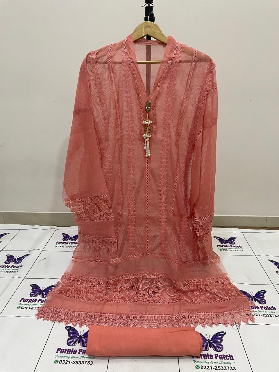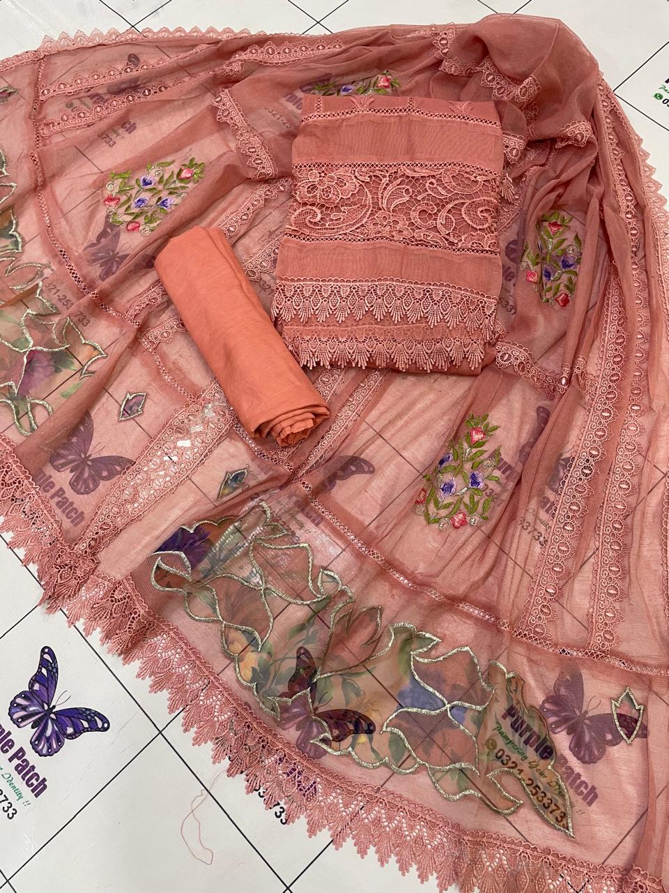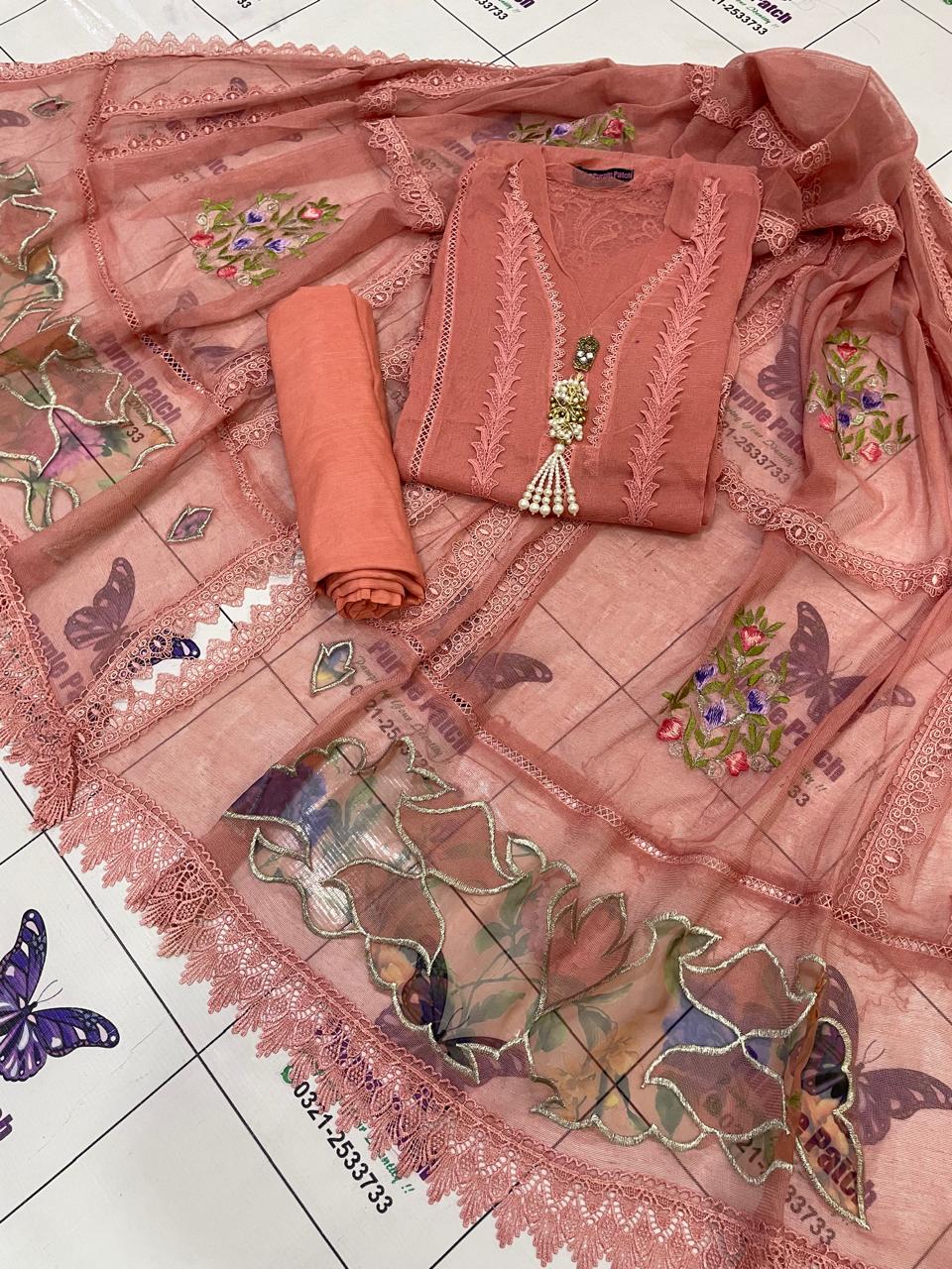 Flora Applic Collection 3 pc semi stitch Khadi cotton net stuff Available in 9 colours