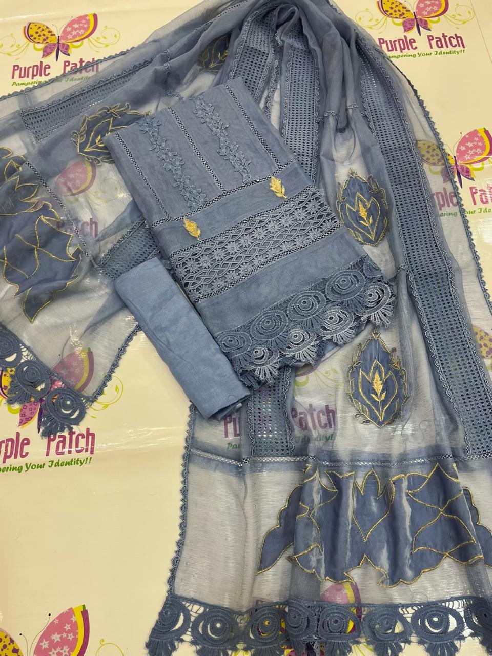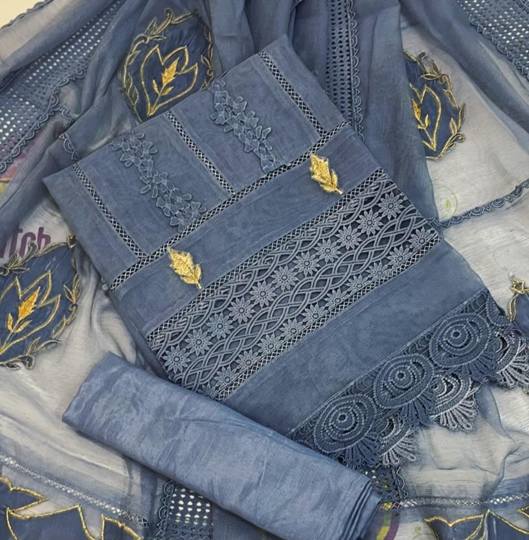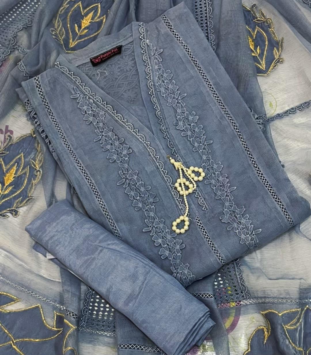 ✨ Makhmal Collection – Eid Festive Wear ✨ Step into timeless elegance this Eid with our Makhmal Collection, where luxury meets effortless comfort. Designed for women who appreciate fine craftsmanship, this ensemble blends rich textures with intricate detailing for a truly graceful look. The shirt and dupatta are crafted from ethereal Khadi Net, enhanced with plush velvet appliqué, shimmering tilla work, and delicate lace accents. Paired with a raw silk trouser, the outfit offers a perfect balance of sophistication and wearability. A complimentary tassel hanging adds a charming finishing touch. Product Details: Fabric: Khadi Net with Velvet Work: Velvet appliqué with tilla & delicate laces Shirt & Dupatta: Khadi Net Trouser: Raw Silk Length: 45+ inches Colors: Available in 9 stunning shades Style: 3-Piece Semi-Stitched Size: Can be tailored from S to XXL Extra: Complimentary tassel hanging Perfect for Eid gatherings and festive occasions, the Makhmal Collection promises an elegant statement with every wear.
