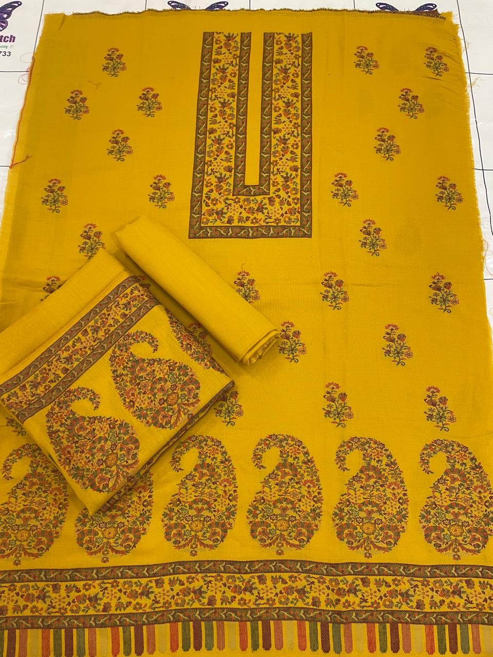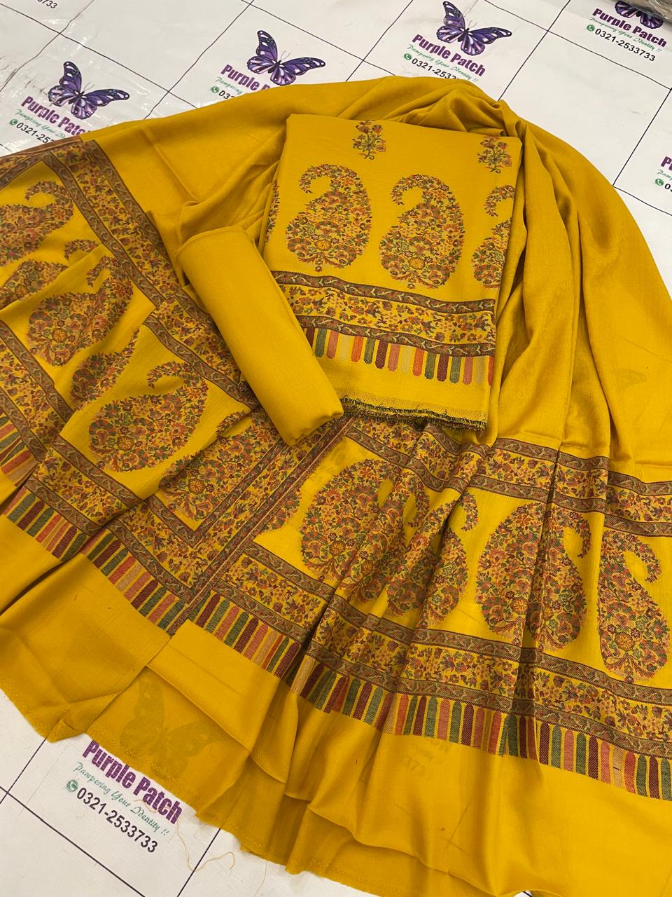 Work details: Jacquard Kani Shirt Daman UpTo 27-28 inches Shirt Length 43-44 inches Shawl 2.5 yards Trouser 2.5 yard Cleaning: Dry clean is always recommended and a safe solution if you are not confident in hand wash. Or, wash it in cold water using woolite. Detergent must be dissolved completely before putting pashmina in water. Do not twist during washing. Do not wring dry. Do not dry the Pashmina in direct sunlight after washing. In addition, spread it on a towel and put it in the air to let it dry naturally. Use very low temperature, iron with a cover sheet. To maintain its newness. Never hang a Pashmina in the closet as it can cause the fabric to stretch and lose its shape. Store your Pashmina in a muslin cloth to avoid the development of lint or short fibers that separate the surface of cloth or yarn. Fold it neatly inside out in moth-proof stuff. Keep your Pashmina at a cool, dry place. Stitching: We recommend Using a thin seam reinforcement: Pashmina is very loosely woven and can split apart, so you can use a thin seam reinforcement to reinforce the fabric where you’re stitching. Stitch pashmina suits an inch loose from your regular size. Make shalwar instead of pants. Stitching pashmina suits with under linings may reduce the chances of getting torn