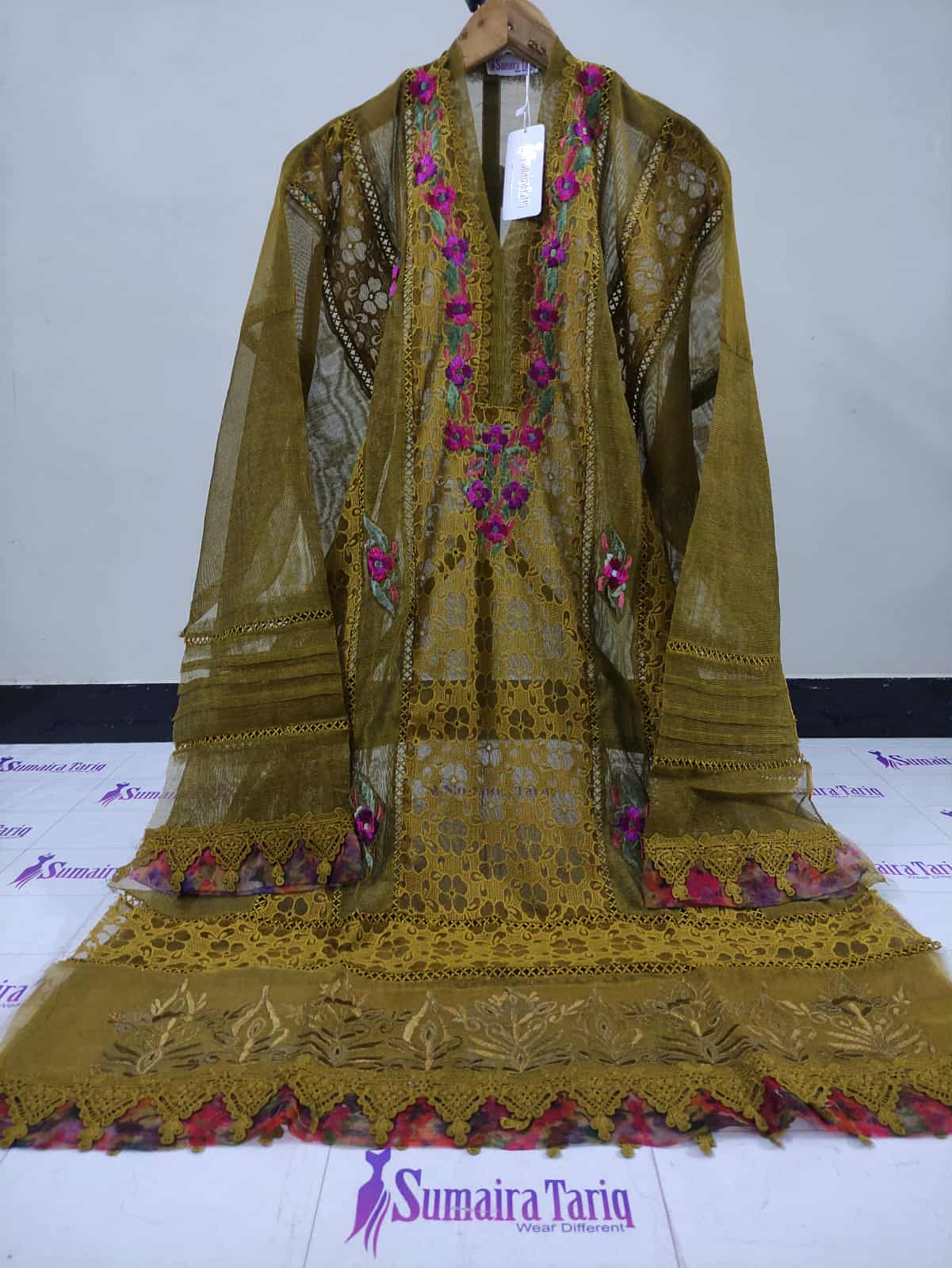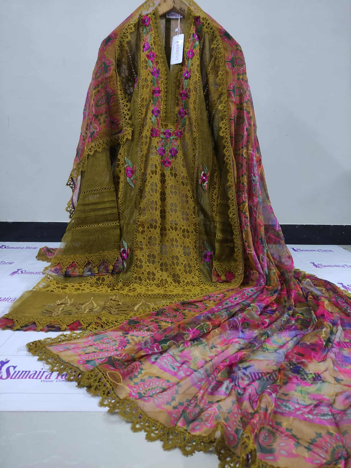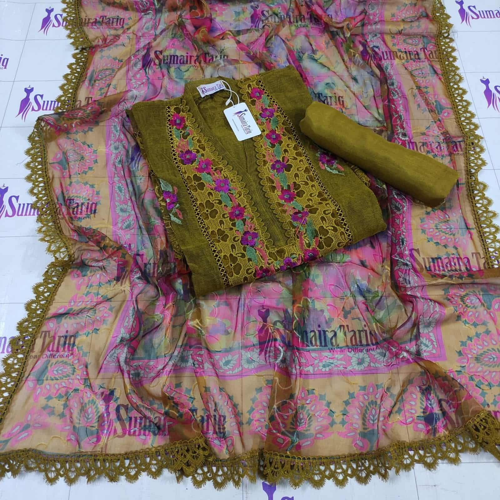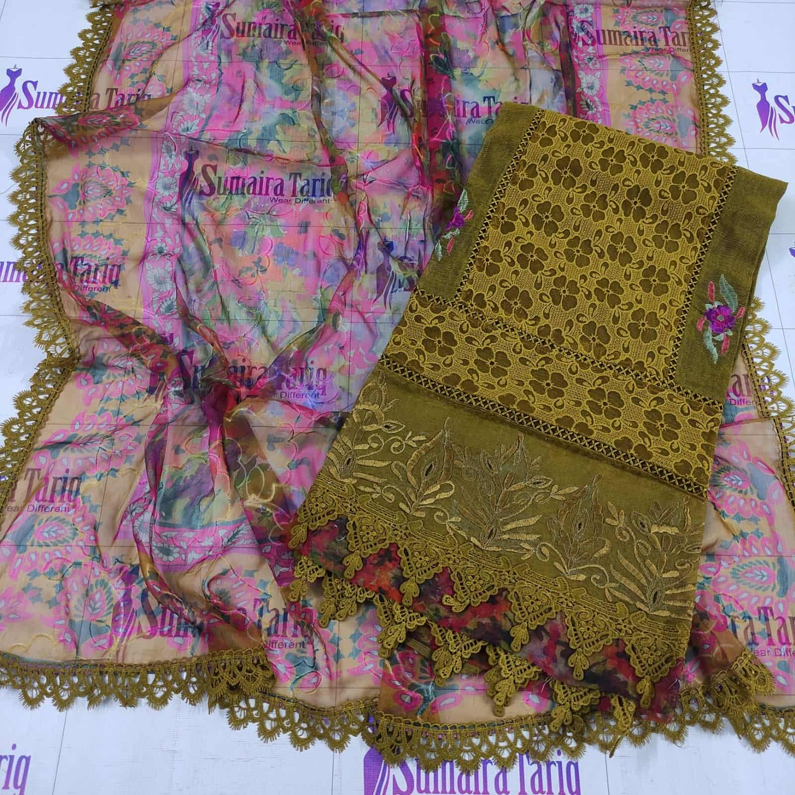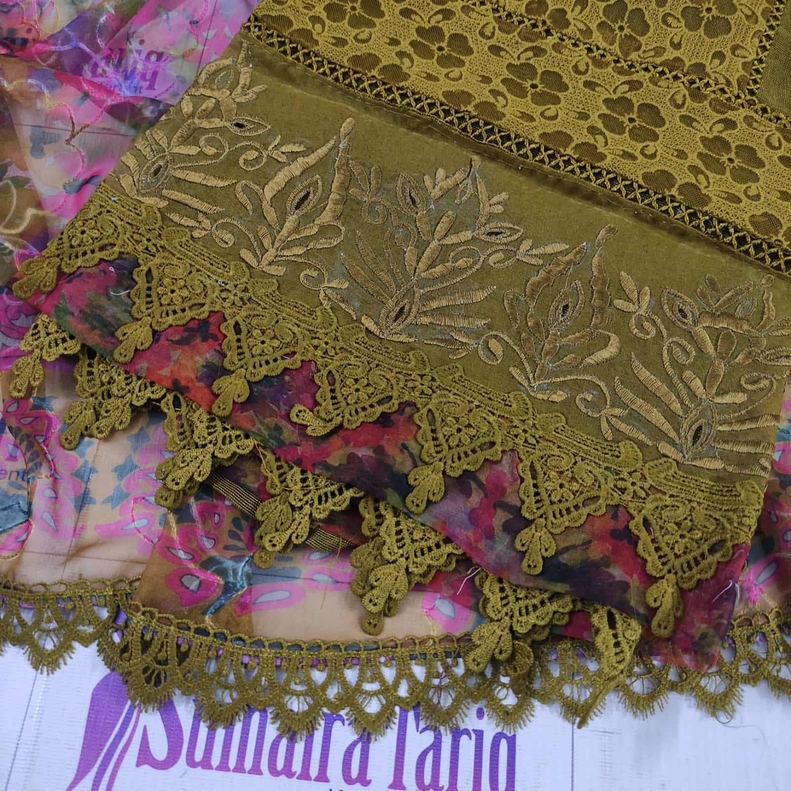 QAUS O QAZAH Collection – Chicken Kari Panel Step into elegance with our QAUS O QAZAH Collection, crafted in 10 vibrant colors with a graceful paneling style. Perfect for festive and formal occasions, this outfit blends tradition with modern sophistication. ✨ Features: Shirt: Premium Qureshia & soft embroidered net with intricate multi-thread embroidery, delicate cutwork, and 3D embellishments. Shirt Length: 47″ | Chest: 28″ Dupatta: Chiffon with elegant thread embroidery and lace finishing (2.5 yards). Trouser: Unstitched raw silk (2.5 yards). 💎 Highlights: Luxurious Chicken Kari panel design Intricate thread embroidery & cutwork Flowing chiffon dupatta for a graceful drape Available in 10 stunning colors 📦 Price: Rs. 5,700/- 🚚 Delivery Charges: Rs. 300 (all over Pakistan) ✨ COD available nationwide 🌍 Worldwide shipping available 📲 Order Now: WhatsApp us at 03212533733 or shop directly at www.purple-patch.com.pk