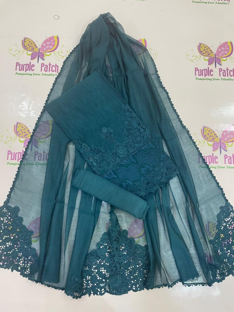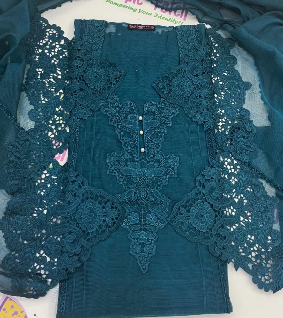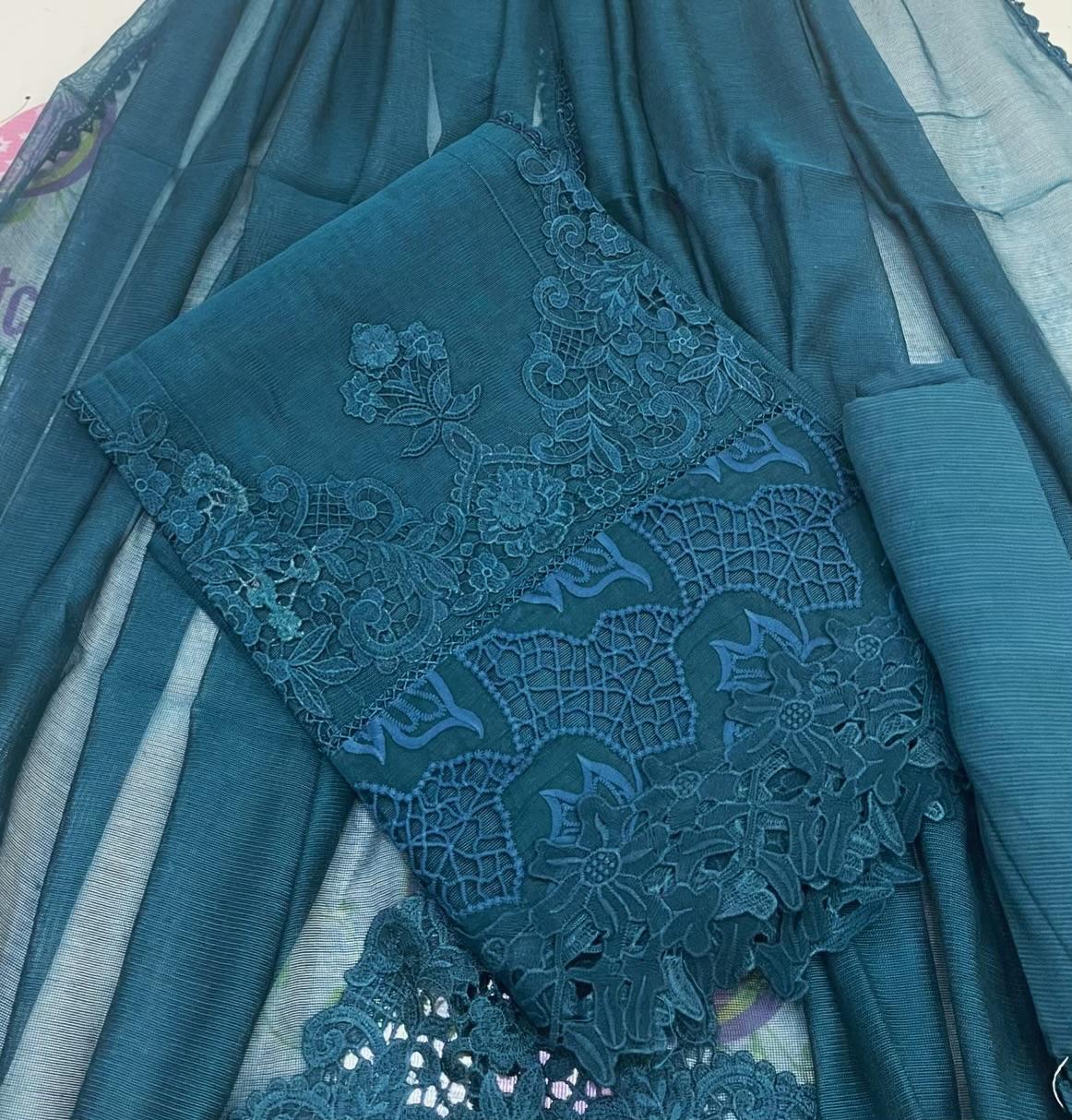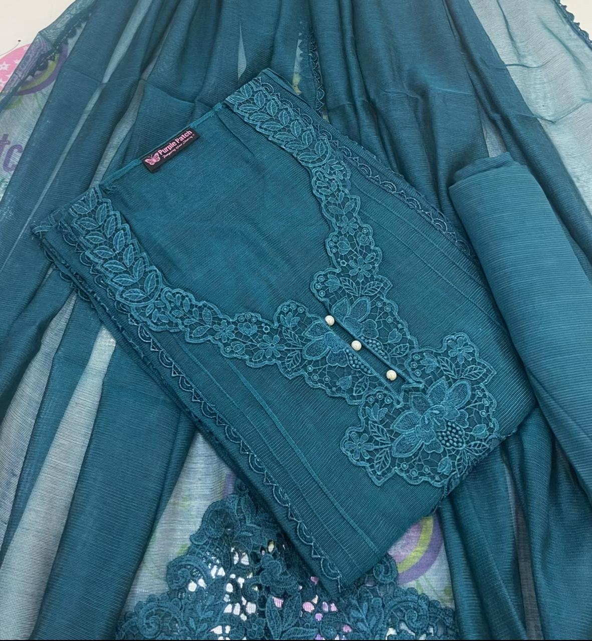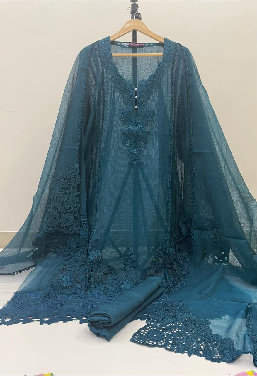 Designed with delicate embroidery and refined cutwork detailing, this ensemble perfectly blends festive charm with modern styling. The breathable Khadi Cotton Net fabric ensures comfort while maintaining a luxurious festive look, making it an ideal choice for Eid gatherings and special occasions.