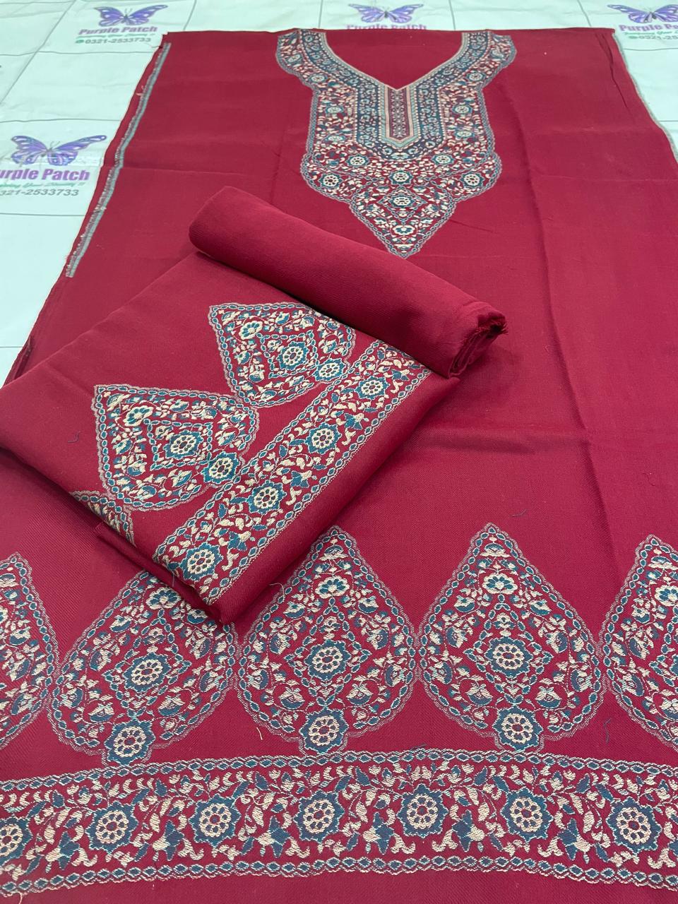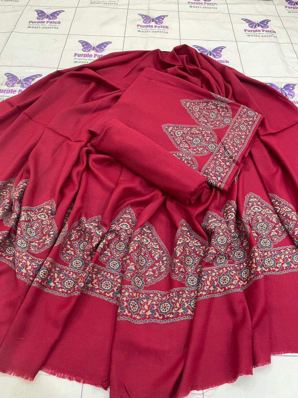 Work details: Kani ( Hand woven ) Shirt Daman UpTo 26 inches Shirt Length 43 inches Shawl 2.5 yards Trouser 2.5 yard Cleaning: Dry clean is always recommended and a safe solution if you are not confident in hand wash. Or, wash it in cold water using woolite. Detergent must be dissolved completely before putting pashmina in water. Do not twist during washing. Do not wring dry. Do not dry the Pashmina in direct sunlight after washing. In addition, spread it on a towel and put it in the air to let it dry naturally. Use very low temperature, iron with a cover sheet. To maintain its newness. Never hang a Pashmina in the closet as it can cause the fabric to stretch and lose its shape. Store your Pashmina in a muslin cloth to avoid the development of lint or short fibers that separate the surface of cloth or yarn. Fold it neatly inside out in moth-proof stuff. Keep your Pashmina at a cool, dry place. Stitching: We recommend Using a thin seam reinforcement: Pashmina is very loosely woven and can split apart, so you can use a thin seam reinforcement to reinforce the fabric where you’re stitching. Stitch pashmina suits an inch loose from your regular size. Make shalwar instead of pants. Stitching pashmina suits with under linings may reduce the chances of getting torn.