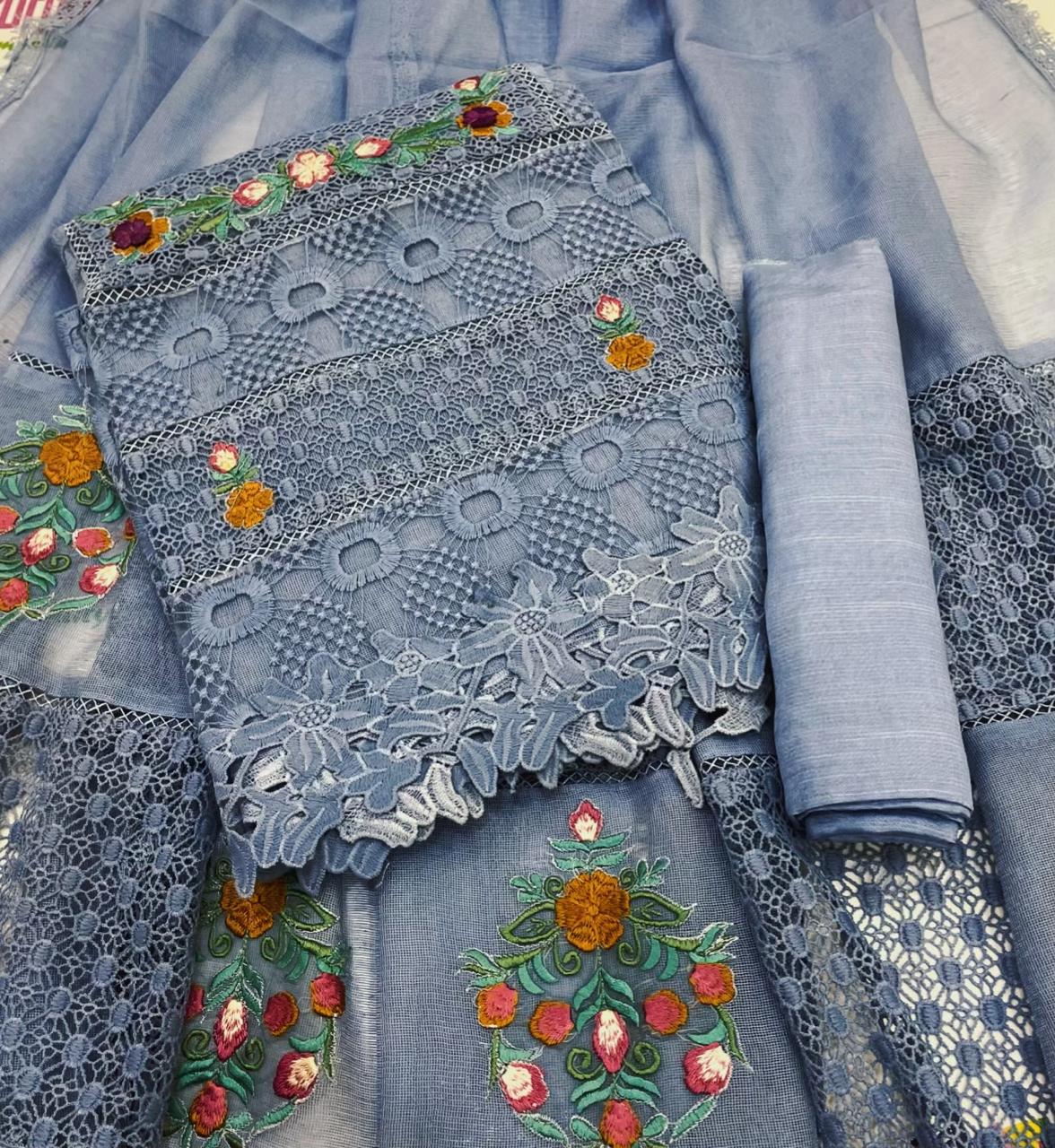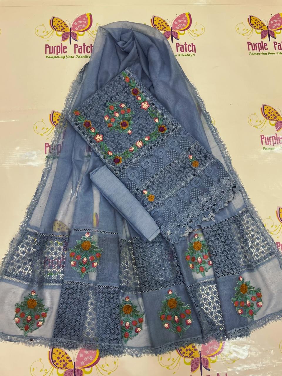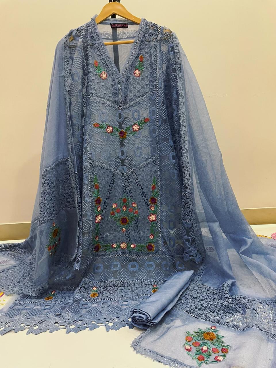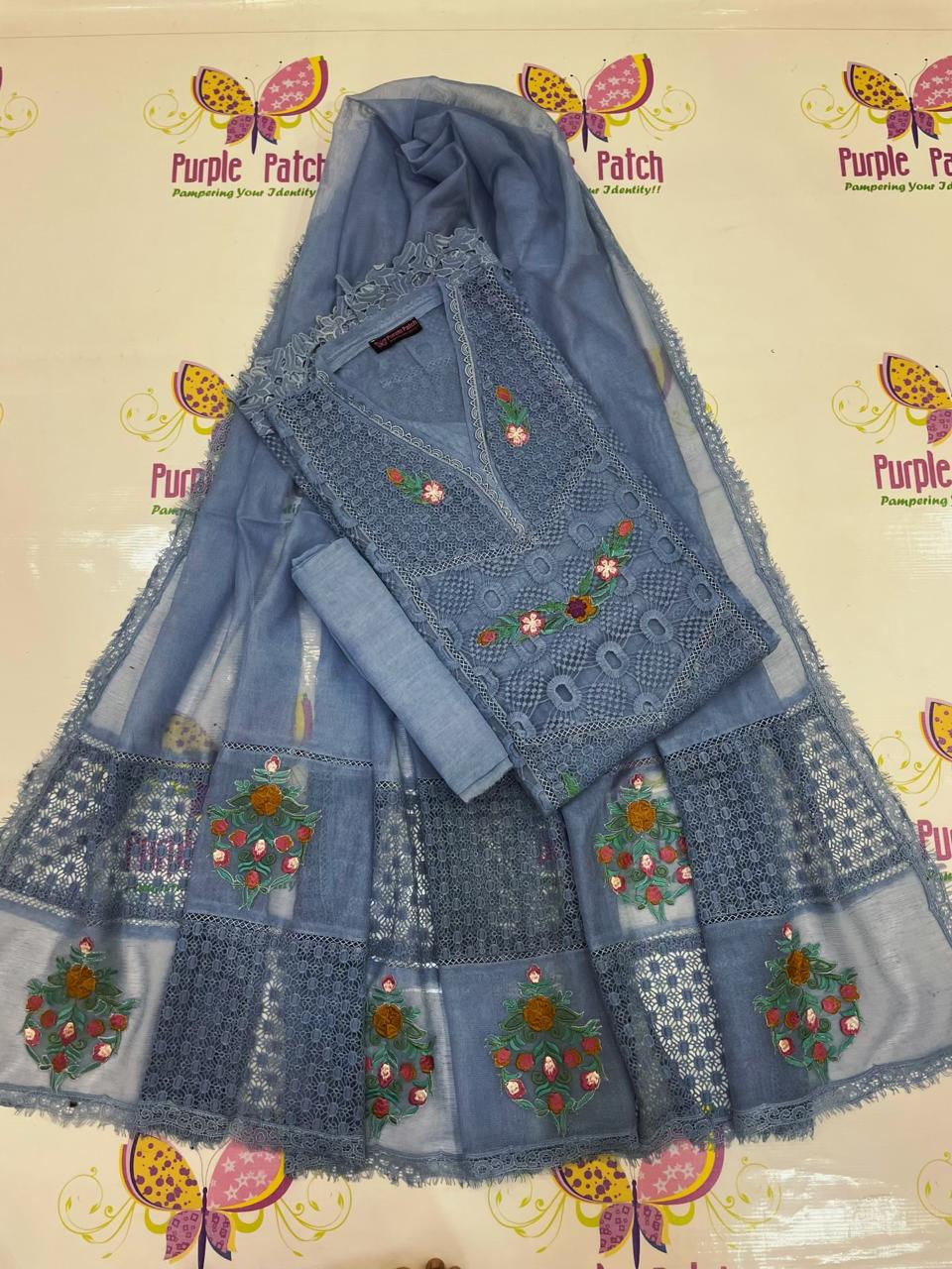 Resham Collection – Purple Patch Brand Elevate your style with our beautifully crafted 3-piece semi-stitched suit from the Resham Collection. Designed for elegance and comfort, this outfit features premium khadi cotton net fabric enhanced with exquisite Qureshia and soft net chicken kari work, finished with intricate multi 3D embroidery for a rich, luxurious look. The suit is semi-stitched, allowing you to customize it to your perfect fit, available in sizes ranging from Small to XXL. With a flattering shirt length of 45+ inches, it offers a graceful silhouette suitable for both casual and festive wear. Each set includes a ready-to-wear dupatta, saving you time while completing your look effortlessly. Available in 10 stunning colors, this collection ensures there’s a perfect shade for every style and occasion. Perfect for those who appreciate fine detailing and versatile fashion, the Resham Collection is a must-have addition to your wardrobe. Dry clean recomended