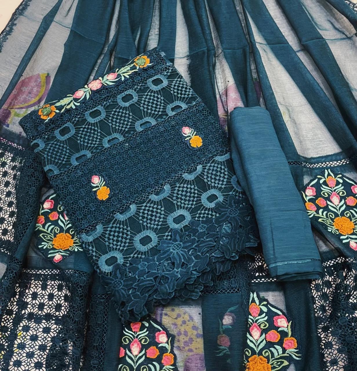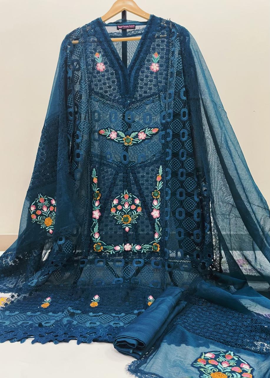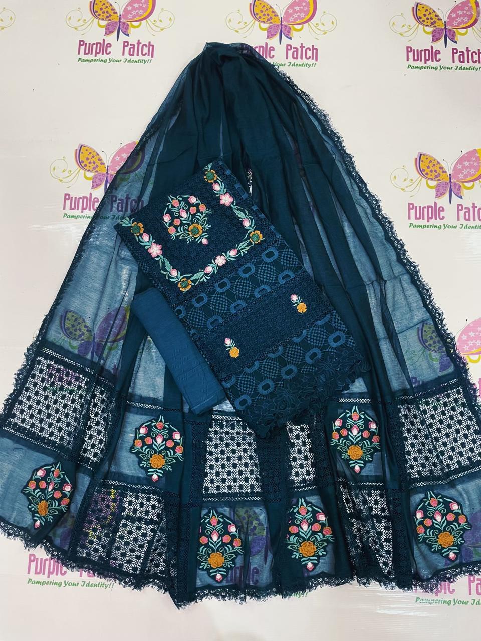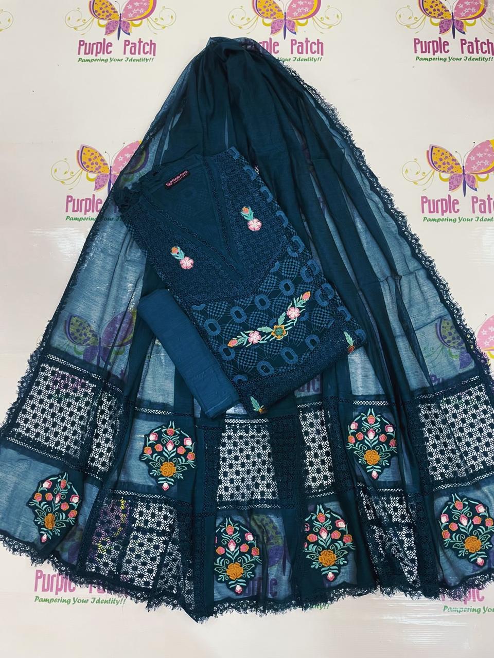 Resham Collection – Purple Patch Brand Elevate your style with our beautifully crafted 3-piece semi-stitched suit from the Resham Collection. Designed for elegance and comfort, this outfit features premium khadi cotton net fabric enhanced with exquisite Qureshia and soft net chicken kari work, finished with intricate multi 3D embroidery for a rich, luxurious look. The suit is semi-stitched, allowing you to customize it to your perfect fit, available in sizes ranging from Small to XXL. With a flattering shirt length of 45+ inches, it offers a graceful silhouette suitable for both casual and festive wear. Each set includes a ready-to-wear dupatta, saving you time while completing your look effortlessly. Available in 10 stunning colors, this collection ensures there’s a perfect shade for every style and occasion. Perfect for those who appreciate fine detailing and versatile fashion, the Resham Collection is a must-have addition to your wardrobe. Dry clean recomended